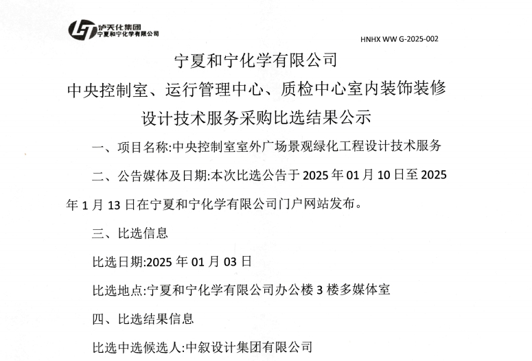寧夏和寧化學(xué)有限公司中央控制室、運(yùn)行管理中心、質(zhì)檢中心室內(nèi)裝飾裝修設(shè)計技術(shù)服務(wù)采購比選結(jié)果公示.pdf [全文]