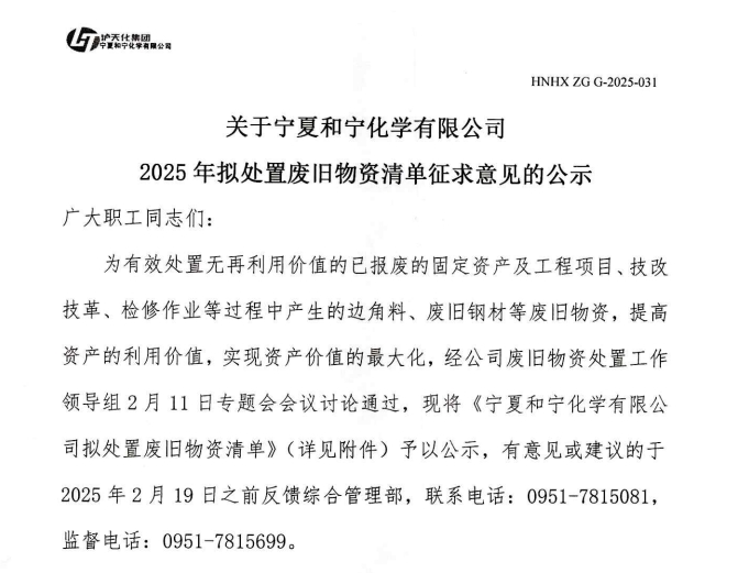 關(guān)于寧夏和寧化學(xué)有限公司2025年擬處置廢舊物資清單征求意見的公示.pdf [全文]