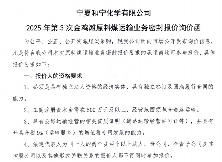 寧夏和寧化學(xué)有限公司2025 年第3次石拉烏素原料煤運(yùn)輸業(yè)務(wù)密封報價詢價函.pdf [全文]