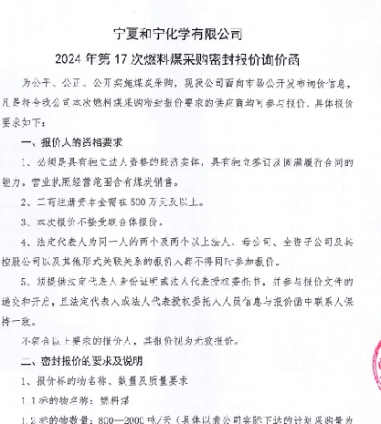 寧夏和寧化學(xué)有限公司2024年第17次燃料煤采購密封報價詢價函.pdf [全文]