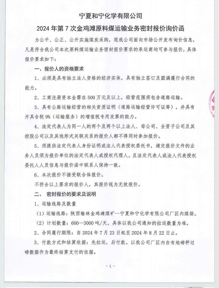 寧夏和寧化學有限公司2024年第7次金雞灘原料煤運輸業(yè)務(wù)密封報價詢函.pdf [全文]