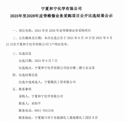 寧夏和寧化學(xué)有限公司2025年至2028年皮帶維修業(yè)務(wù)采購(gòu)項(xiàng)目公開(kāi)比選結(jié)果公示.pdf [全文]