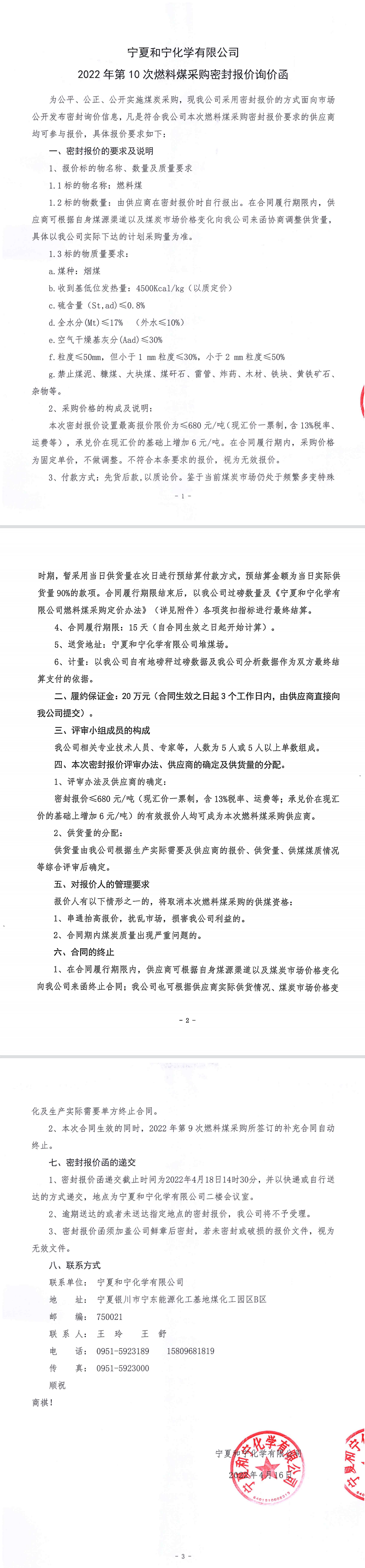 寧夏和寧化學(xué)有限公司2022年第10次燃料煤采購(gòu)密封報(bào)價(jià)詢(xún)價(jià)函