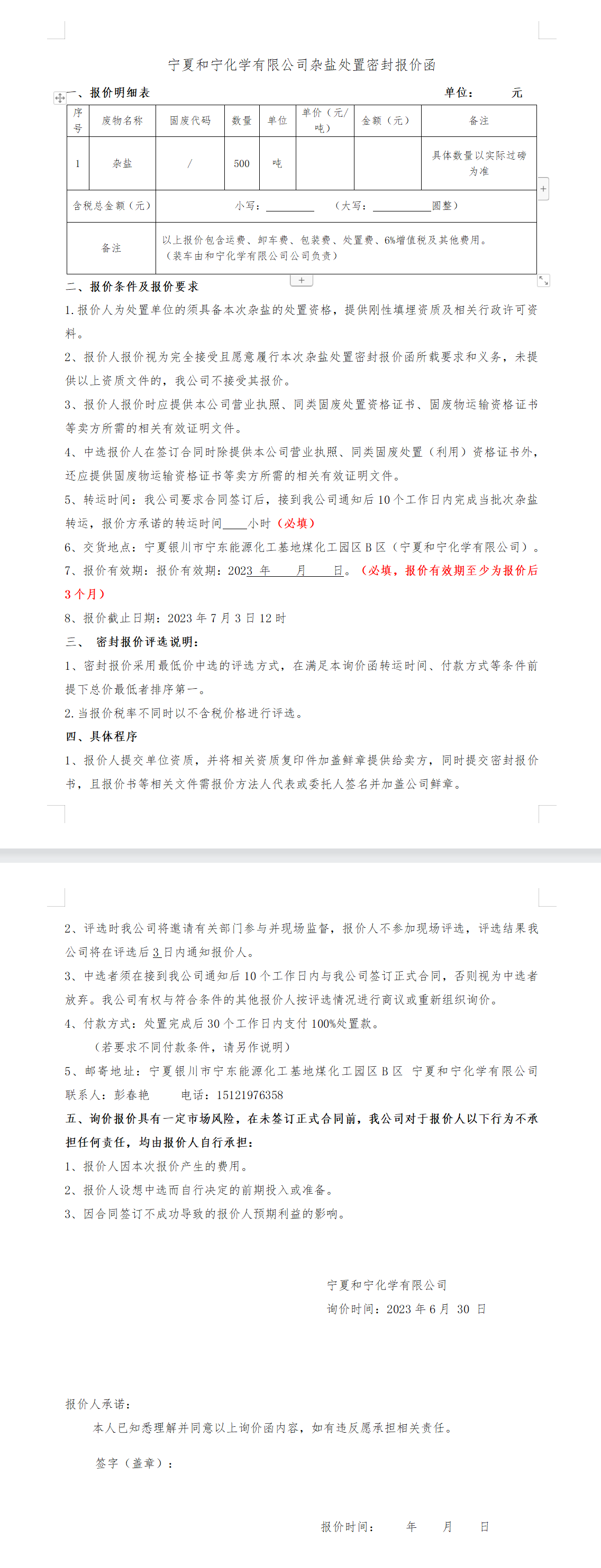 雜鹽處置密封報(bào)價(jià)函