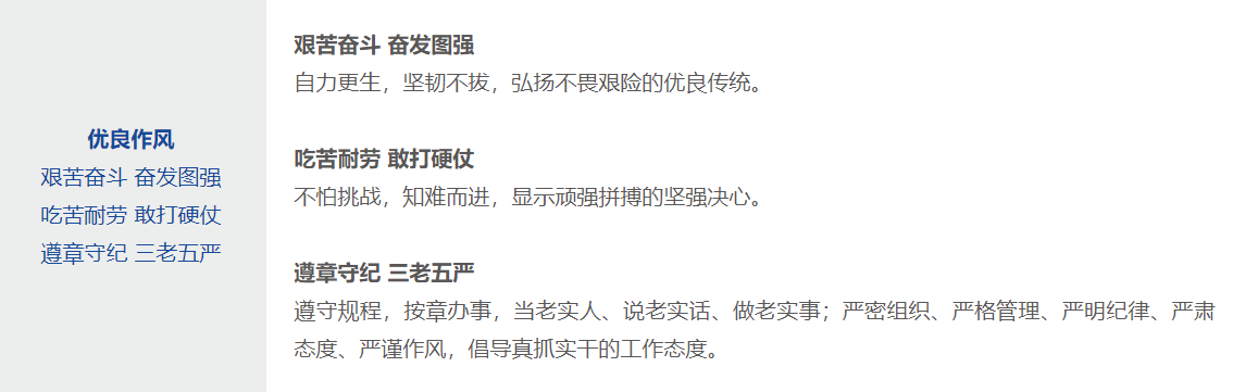 優(yōu)良作風(fēng) 艱苦奮斗 奮發(fā)圖強(qiáng) 吃苦耐勞 敢打硬仗 遵章守紀(jì) 三老五嚴(yán)